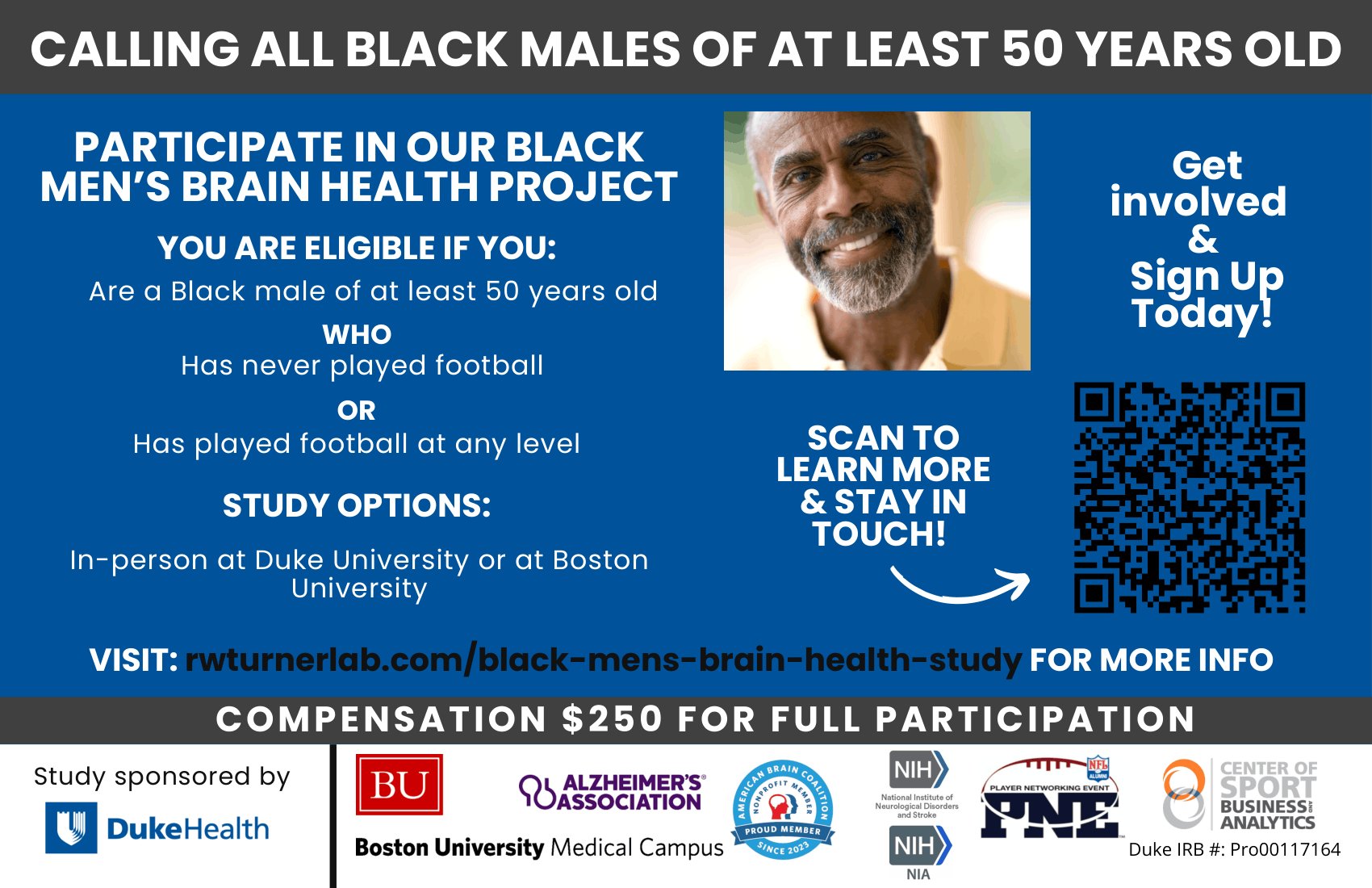 We are recruiting Black males age 50 and above who have played tackle football at any level and those who have never played football or any collision sport. Please select from the buttons below to register today!